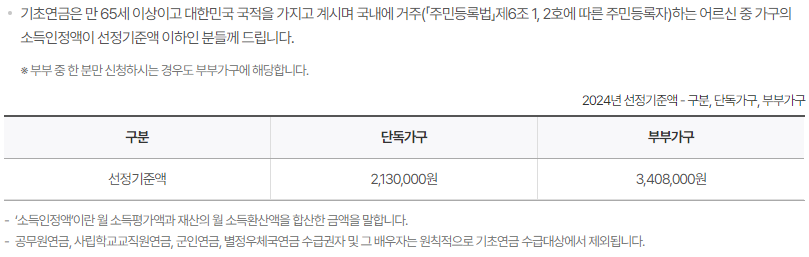 이 조건을 만족하는 어르신들 중 가구의 소득인정액이 선정기준액 이하인 분들이 기초연금을 받을 수 있습니다.