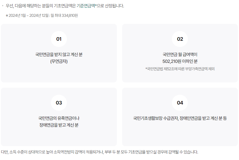 국민연금을 받지 않거나, 국민연금 월 급여액이 502,210원 이하인 분들은 기준연금액을 받을 수 있습니다.