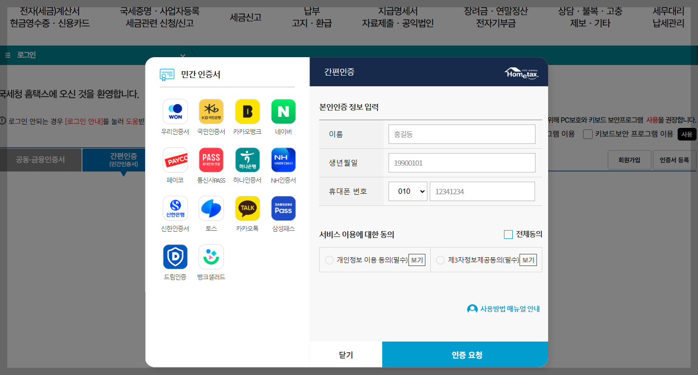 1. 서비스를 이용하려면 국세청 홈택스에 로그인 합니다. (간편인증)